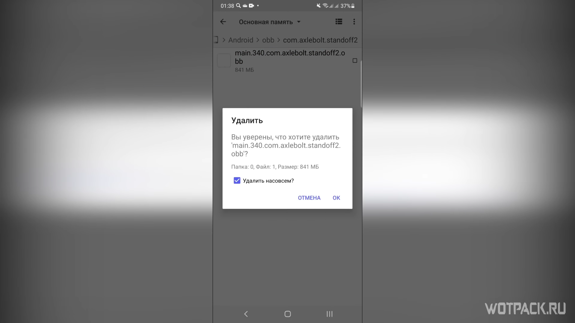 Удалите файл obb, который лежит в последней папке (если он там имеется, если нет — сразу переходите к следующему пункту).